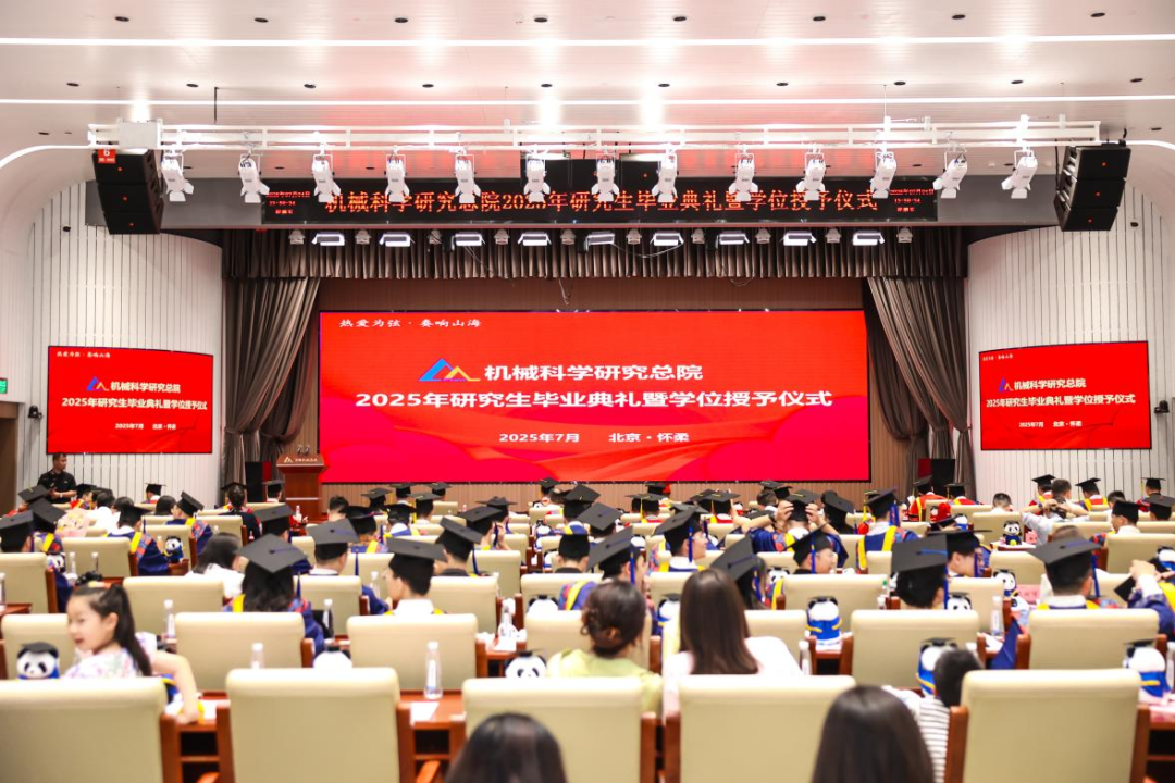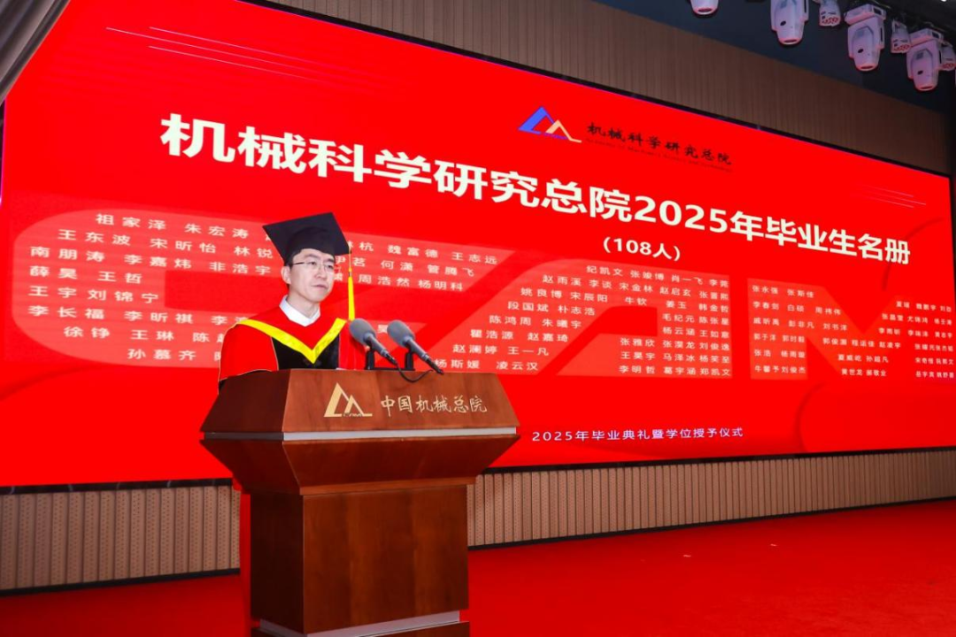 机械总院学位评定委员会主席、集团党委书记、董事长王德成,集团党委副书记、总经理孟祥宇,集团党委副书记、董事李玉鑫,集团党委委员、副总经理王宇,机械总院学位评定委员会副主席、集团副总经理李爱国,集团副总经理姜超出席典礼,机械总院学位评定委员会委员、京内外各二级单位领导、导师代表、研究生管理部门负责人、2025届毕业生及家属共计190余人齐聚一堂,共同见证这一重要时刻。典礼由机械总院学位评定委员会秘书长、研究生院副院长边翊主持。